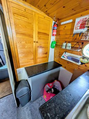 Pump out toilet, shower, and sink with vanity storage.