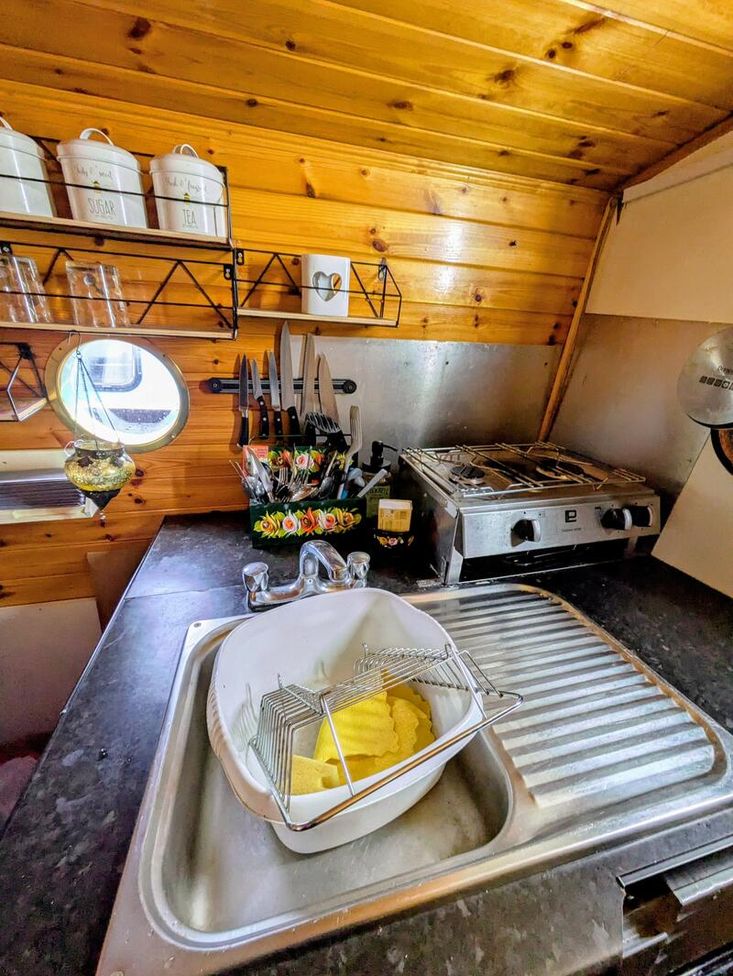 Compact kitchenette, fridge, sink, 2 gas burners, air fryer used as an oven.